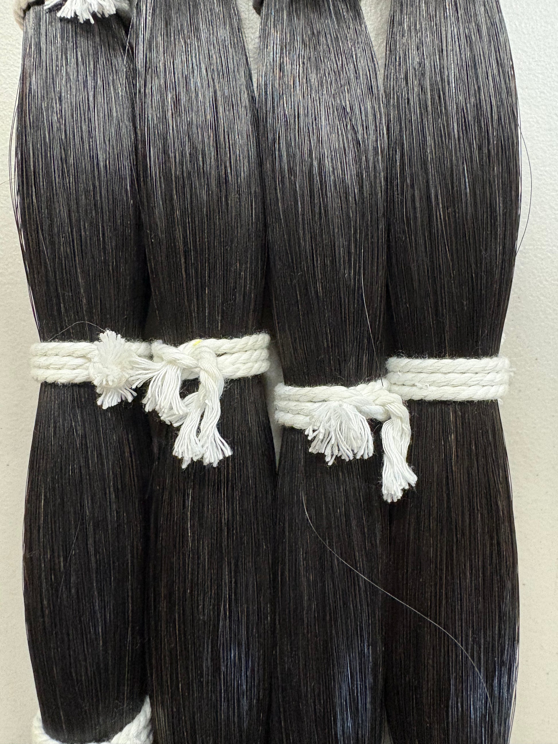 Black natural horsehair is often used for show horses to extended the length and fullness of their tail. First picture shows 1/4 pound our smallest quantity sold. Second picture shows four small bundles tied together into 1 pound. It is processed and ready to use in braiding, hitching, tail extensions and craft projects. We have a large selection of lengths and colors available. It can vary from written and pictured description at times.