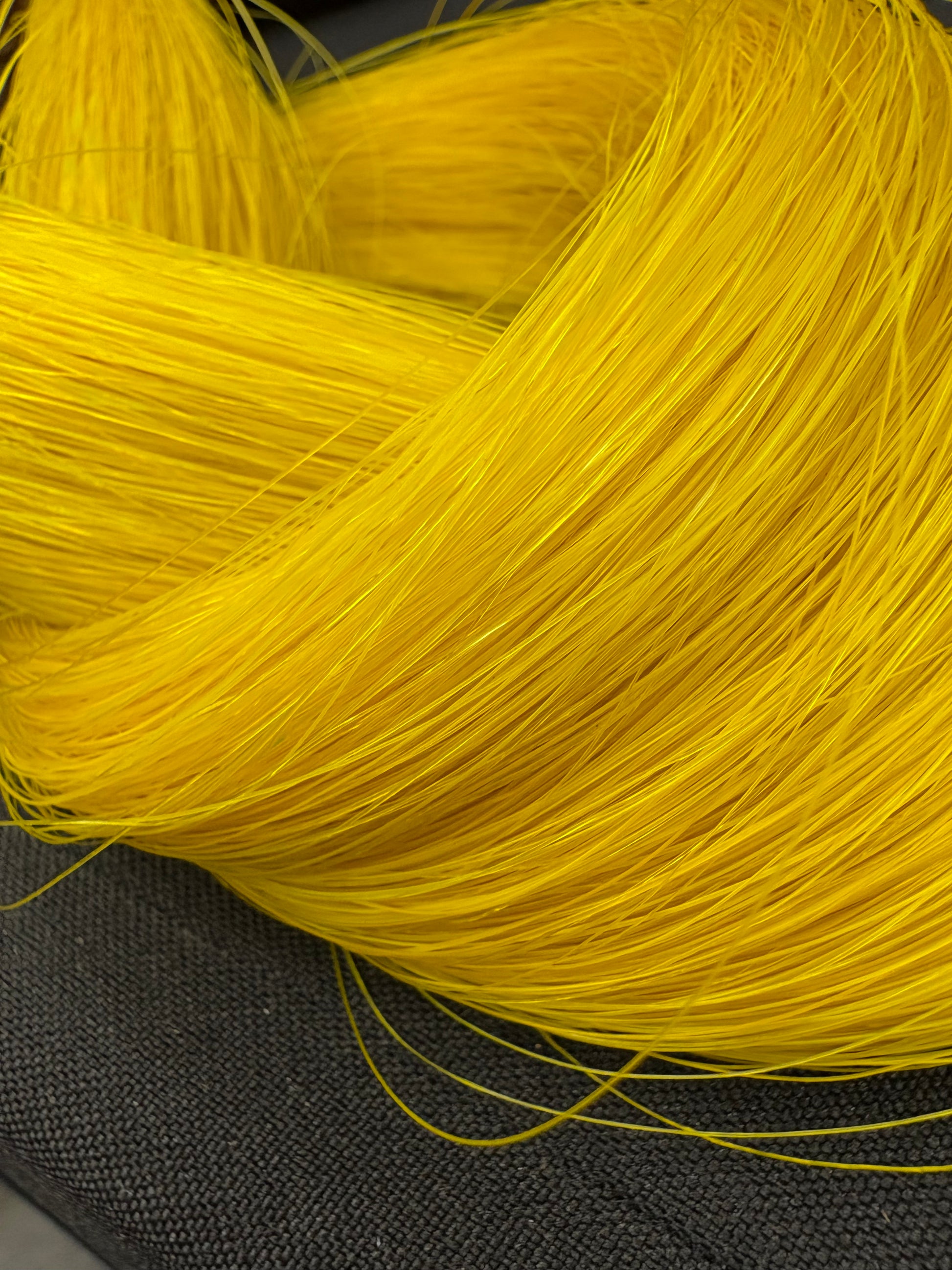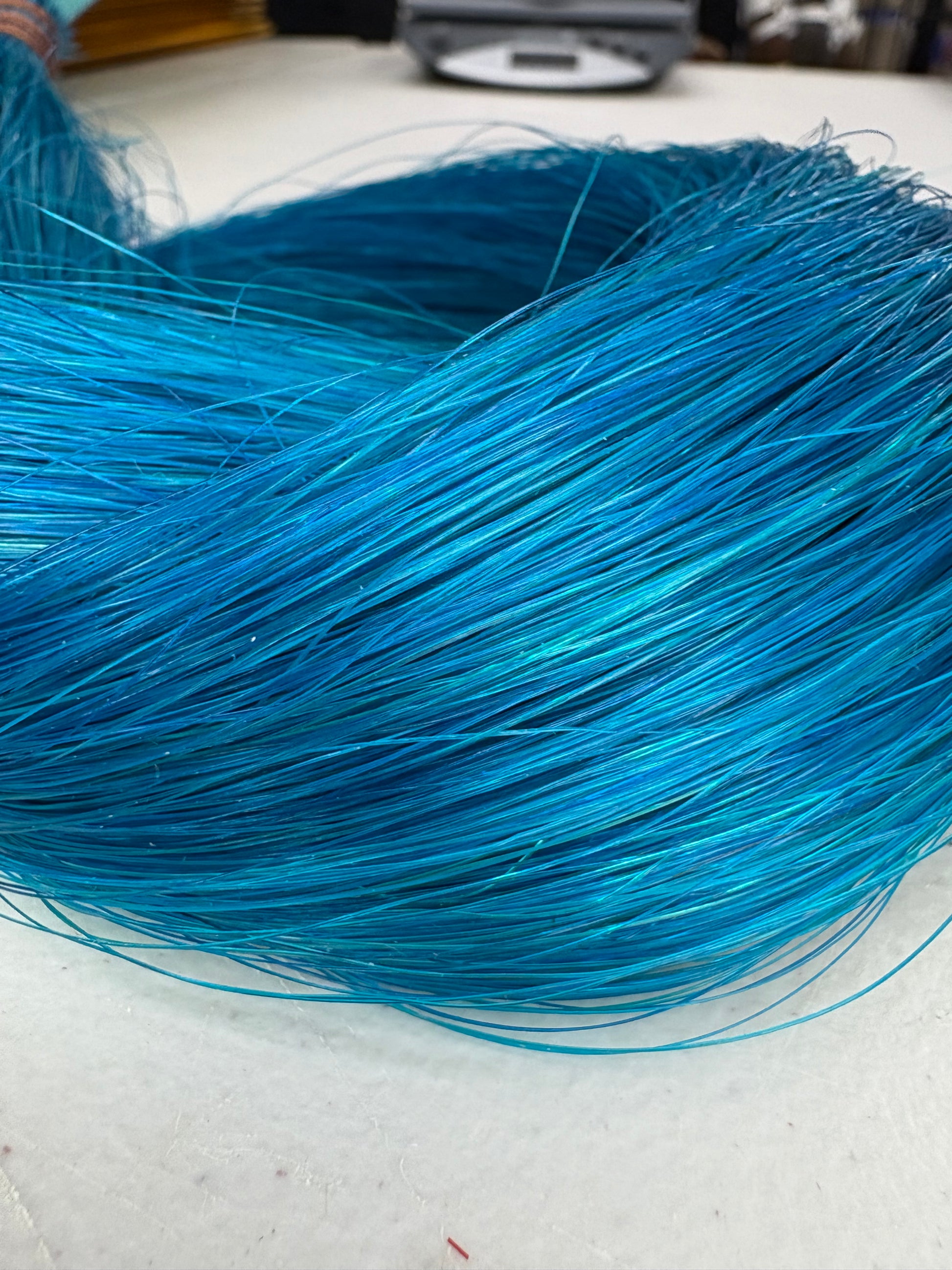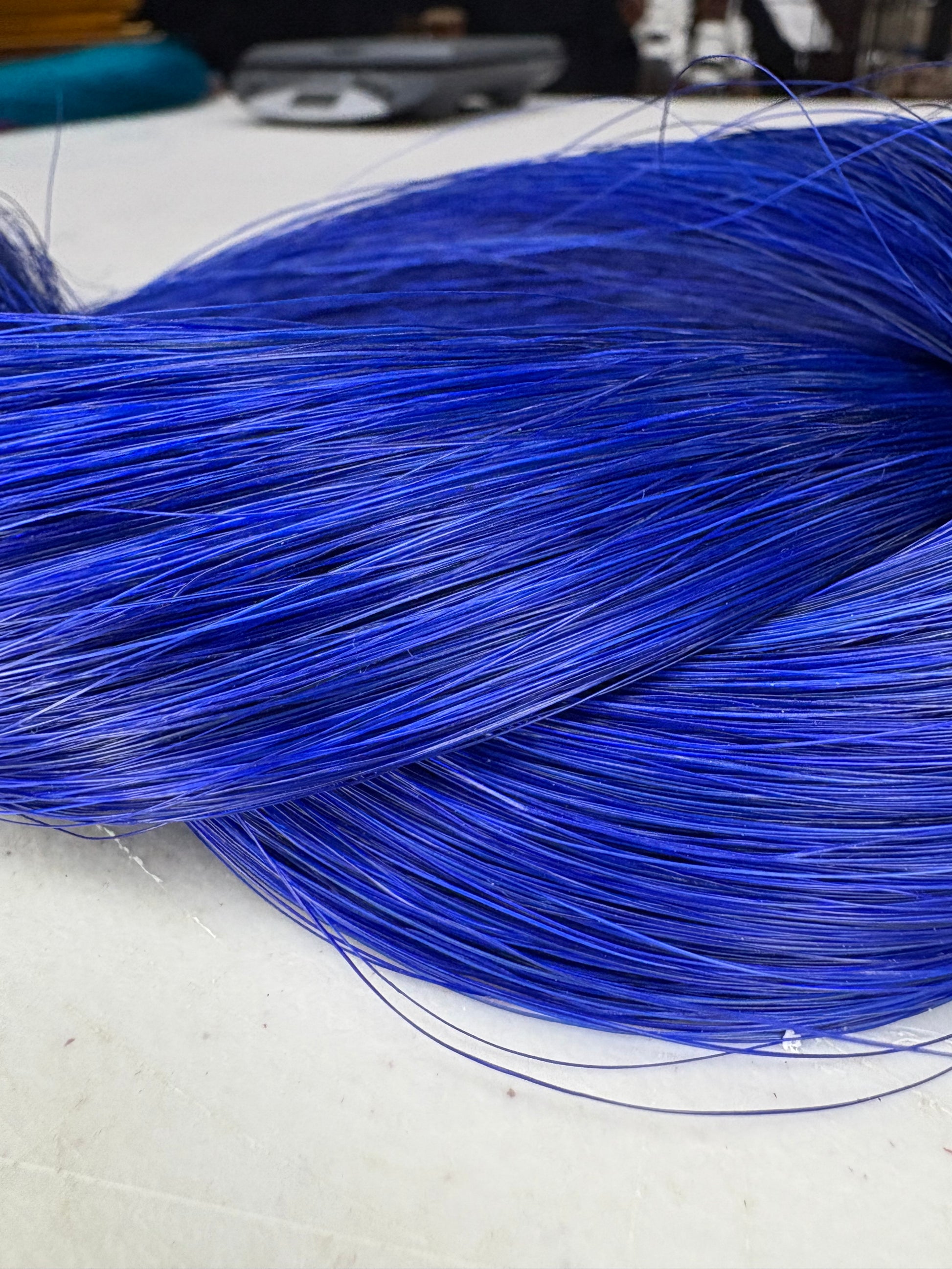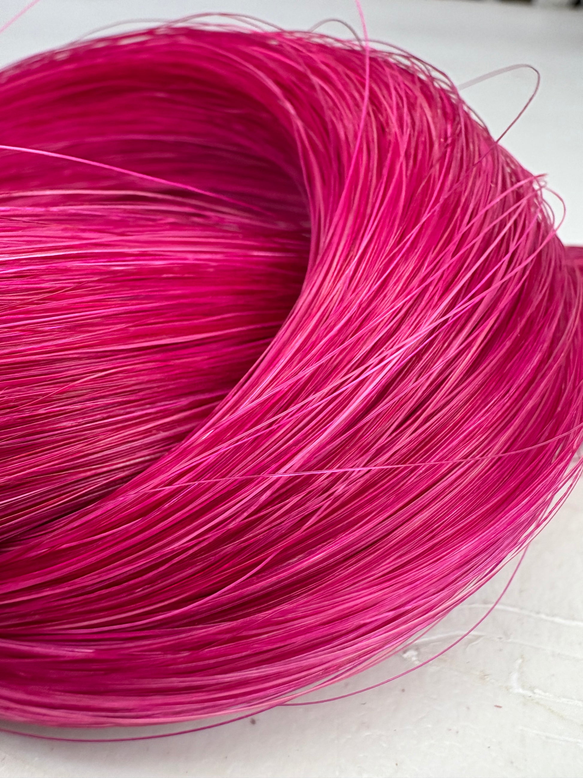 Vibrant dyed colors of real horsehair is available with 1/4 pound minimum. First picture shows a full pound which is four bundles tied together. Pictures of single colors are 1/4 pound. These colors are often seen in hitched and braid work. Currently available in 8 colors in one length 27"-29".